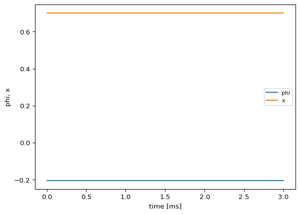 Two-variable diffusion node: dx/dt = esum_x, dphi/dt = esum_phi. The model comprises 2 state variables.