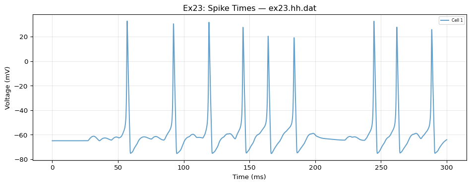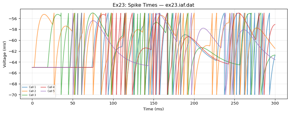 import matplotlib.pyplot as pltimport numpy as npfor name, ref_arr in ref_outputs.items(): t = ref_arr[:, 0] *1000 fig, ax = plt.subplots(figsize=(10, 4))for i inrange(1, min(ref_arr.shape[1], 8)): ax.plot(t, ref_arr[:, i] *1000, alpha=0.7, label=f'Cell {i}') ax.set_xlabel("Time (ms)") ax.set_ylabel("Voltage (mV)") ax.set_title(f"Ex23: Spike Times — {name}") ax.legend(fontsize=6, ncol=2) ax.grid(True, alpha=0.3) plt.tight_layout() plt.show()
