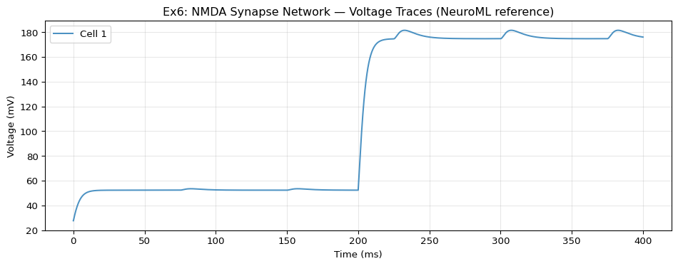 ax.set_title("Ex6: NMDA Synapse Network — Voltage Traces (NeuroML reference)" )
