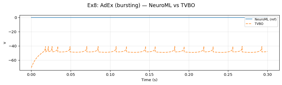 title="Ex8: AdEx (bursting) — NeuroML vs TVBO",