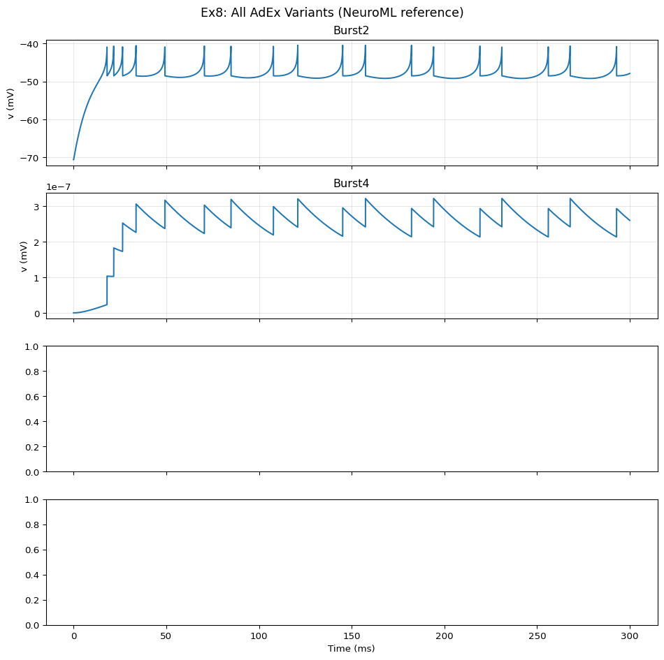 fig.suptitle("Ex8: All AdEx Variants (NeuroML reference)", fontsize=13)