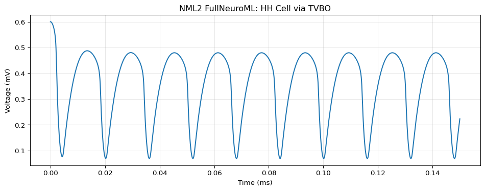 ax.set_title("NML2 FullNeuroML: HH Cell via TVBO" )
