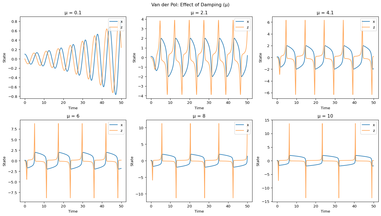 vdp.add_state_variable("z", equation="mu*(1 - x**2)*z - x", initial_value=0.0)