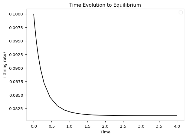 # Time continuation: integrate until system converges to equilibriumt_sols, t_cont = qif_auto.run( c='ivp', name='time', DS=1e-4, DSMIN=1e-10, DSMAX=1e-2, EPSL=1e-08, EPSU=1e-08, EPSS=1e-06, NMX=1000, UZR={14: 4.0}, # Create marker when time (PAR 14) reaches 4.0 STOP={'UZ1'} # Stop at first user marker)# Plot time evolutionqif_auto.plot_continuation('PAR(14)', 'U(1)', cont='time')plt.xlabel('Time')plt.ylabel('r (firing rate)')plt.title('Time Evolution to Equilibrium')plt.show()