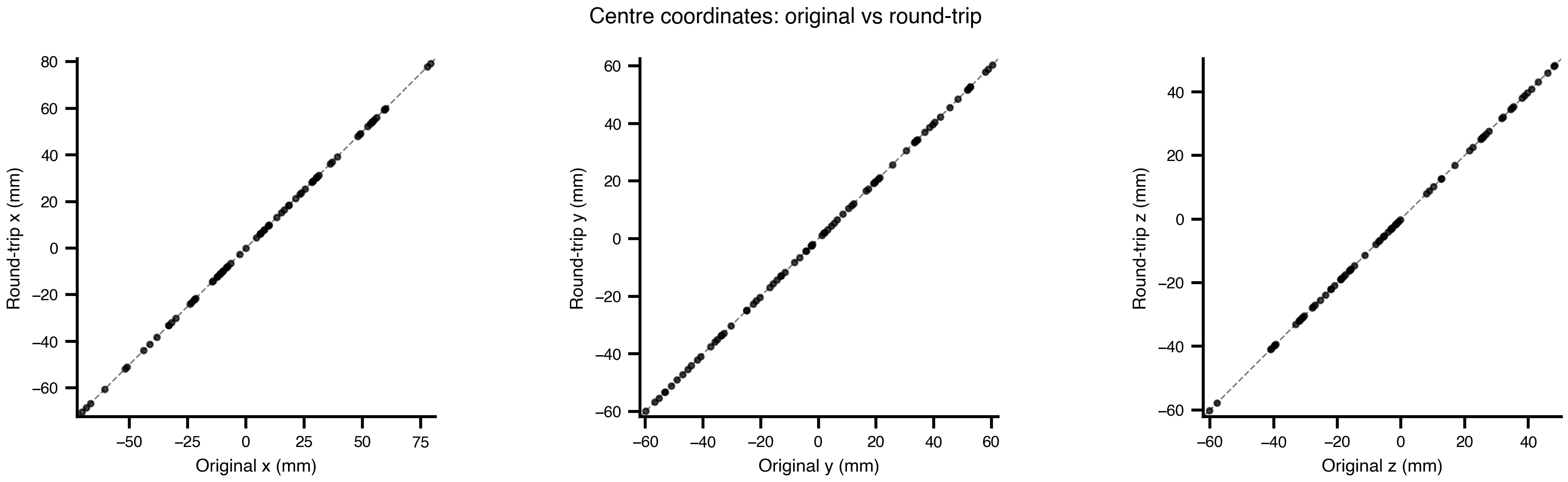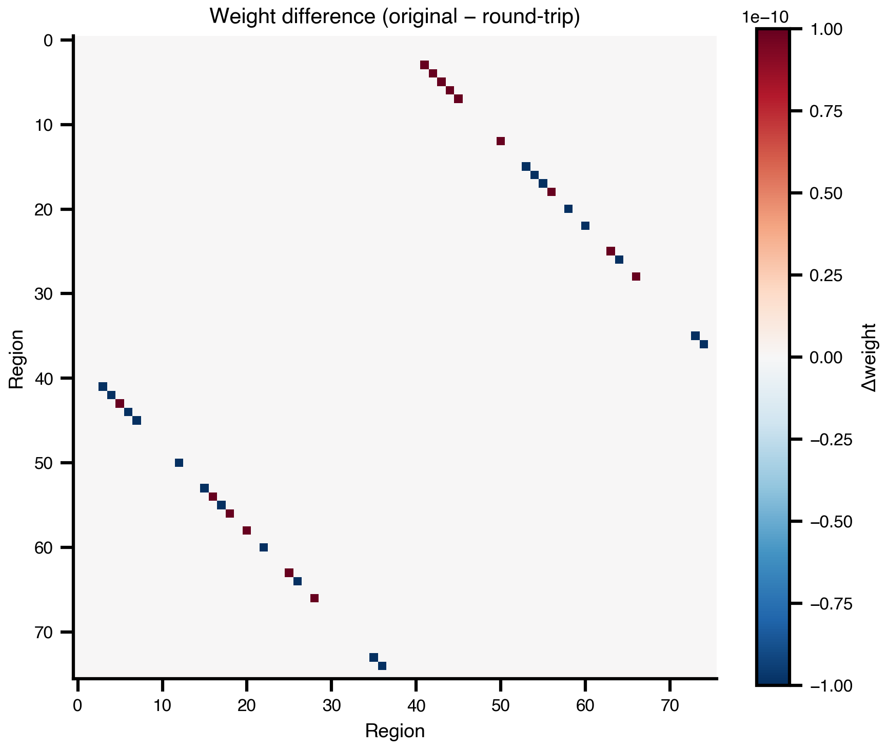 The full pipeline is lossless — all matrices, node metadata, mesh geometry, and region mappings survive the round-trip with zero numerical error.