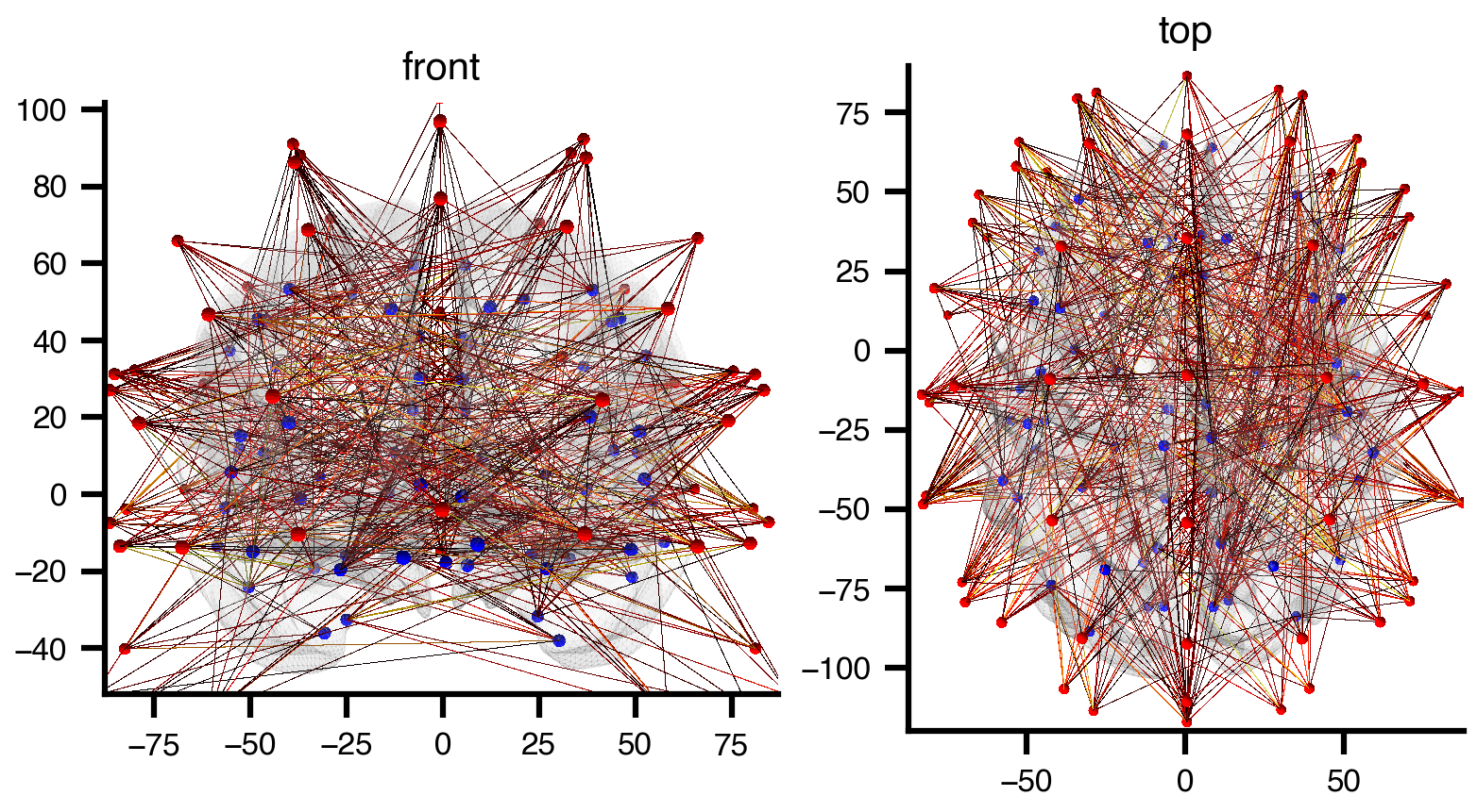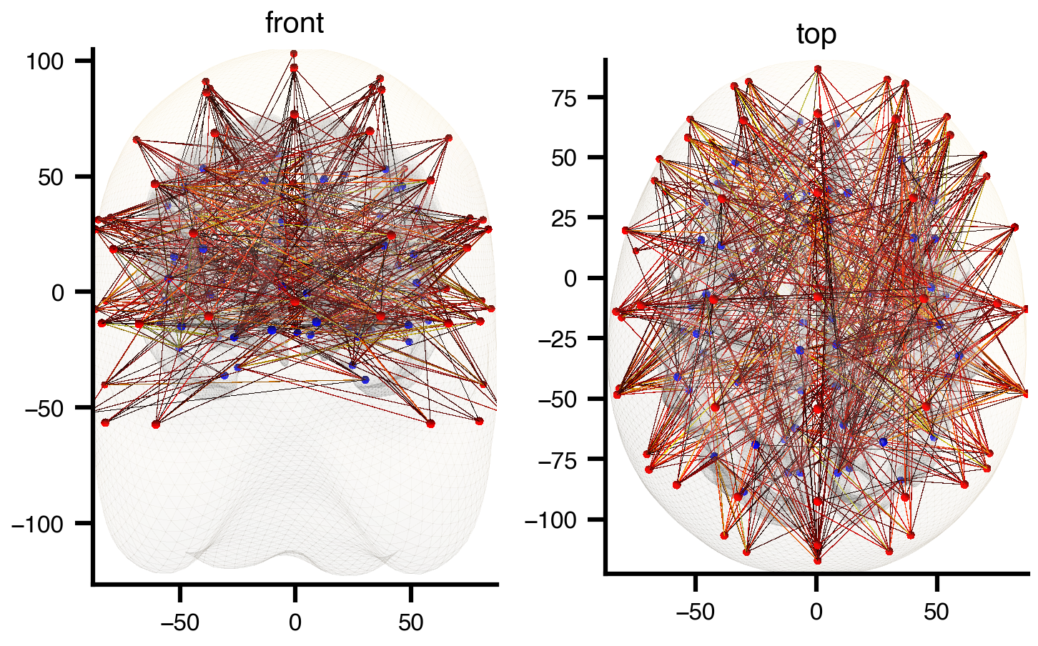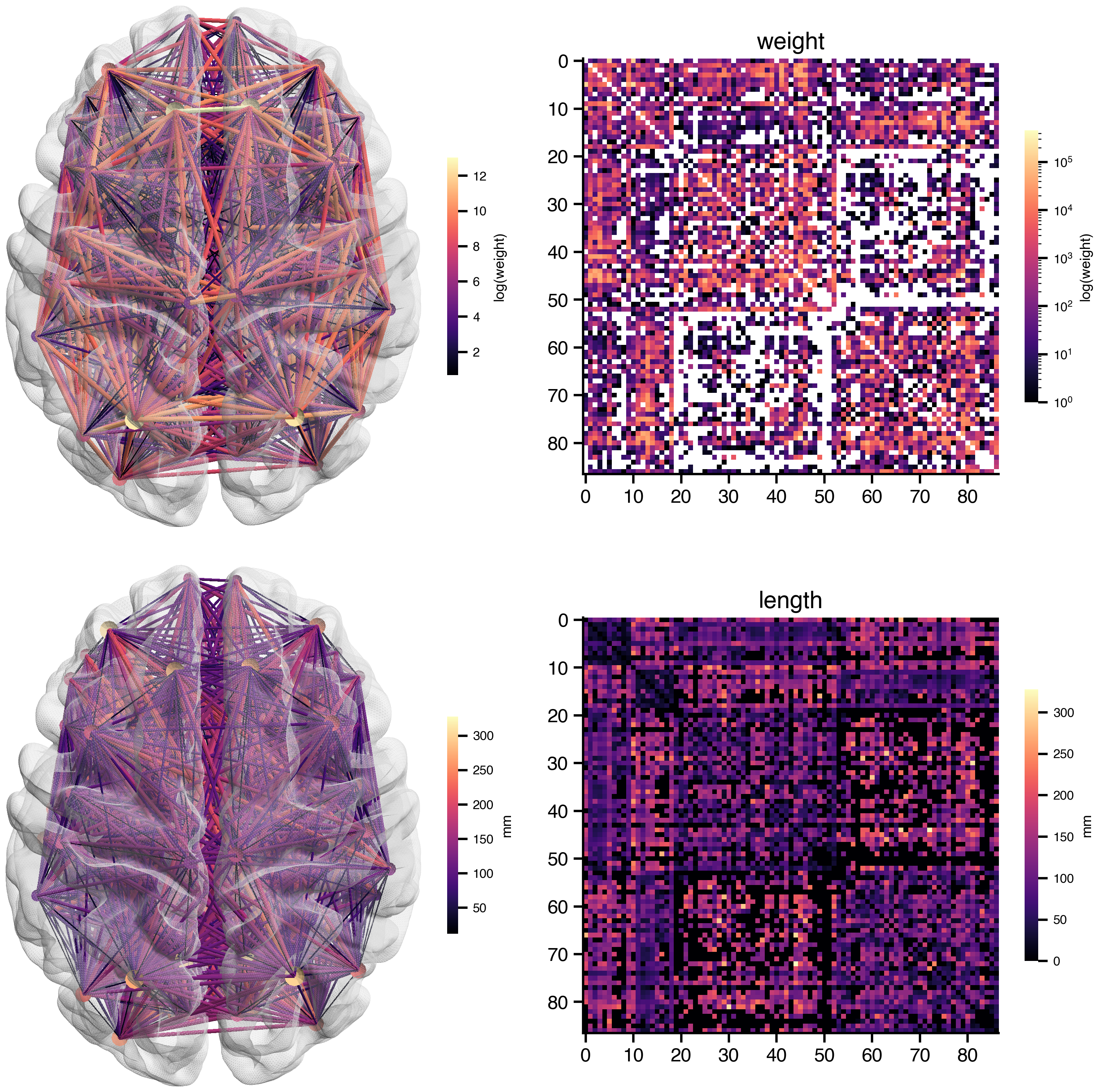 A Network describes the connectivity structure between brain regions: nodes (regions) connected by weighted edges (tracts). TVBO provides several ways to create networks — from inline YAML, from matrices, from files, or from the tvbo platform.