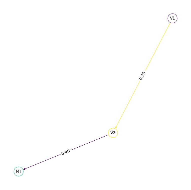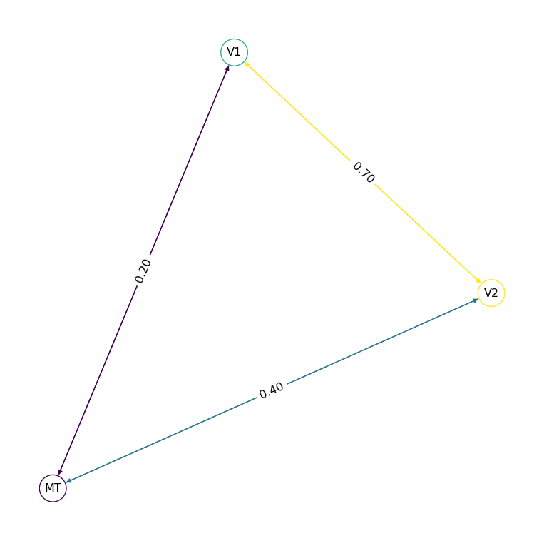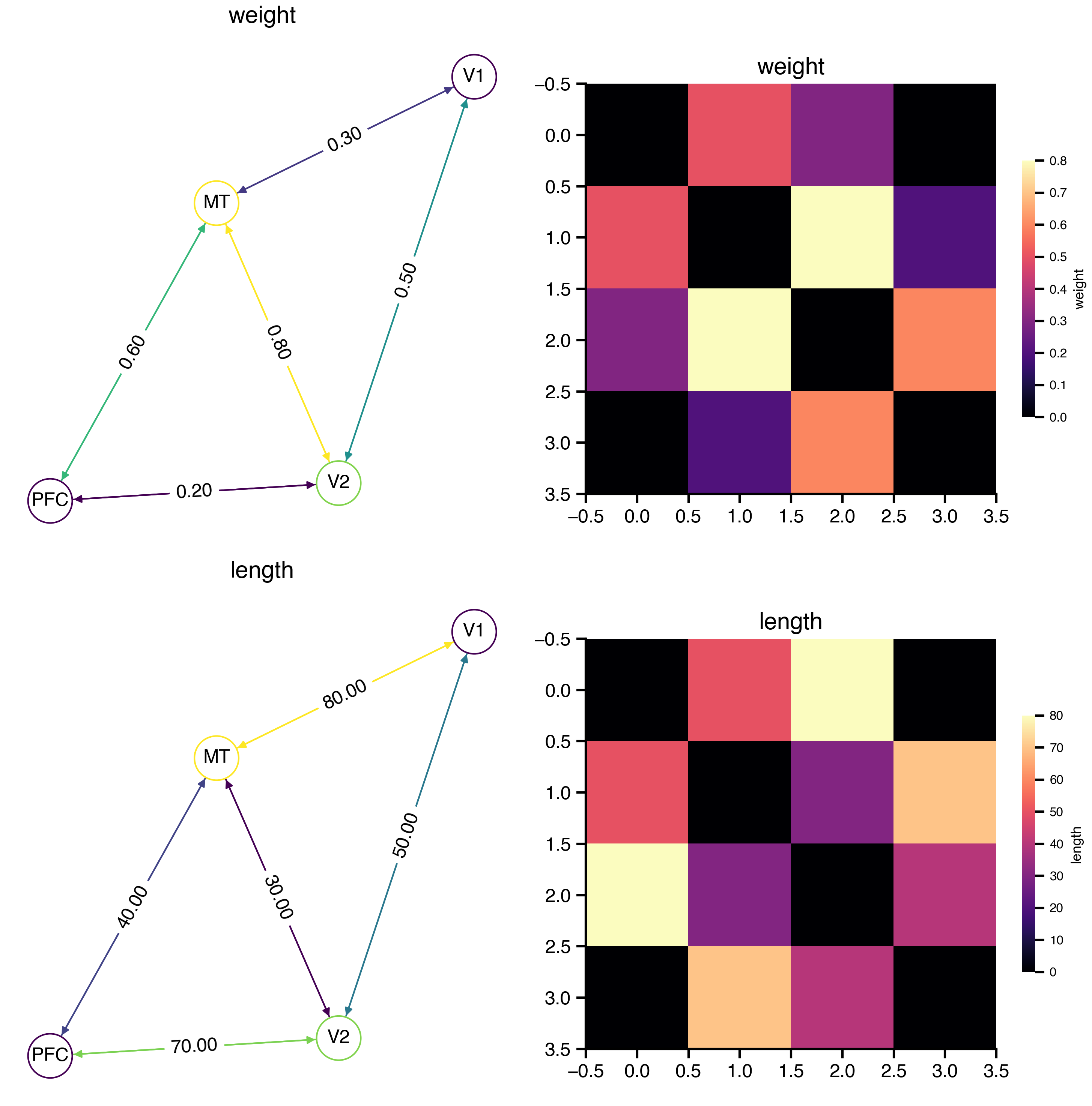 net = Network.from_matrix(W, lengths=L, labels=["V1", "V2", "MT", "PFC"])