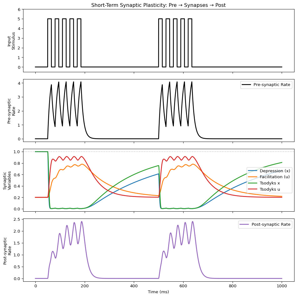 ax.set_title("Short-Term Synaptic Plasticity: Pre → Synapses → Post")