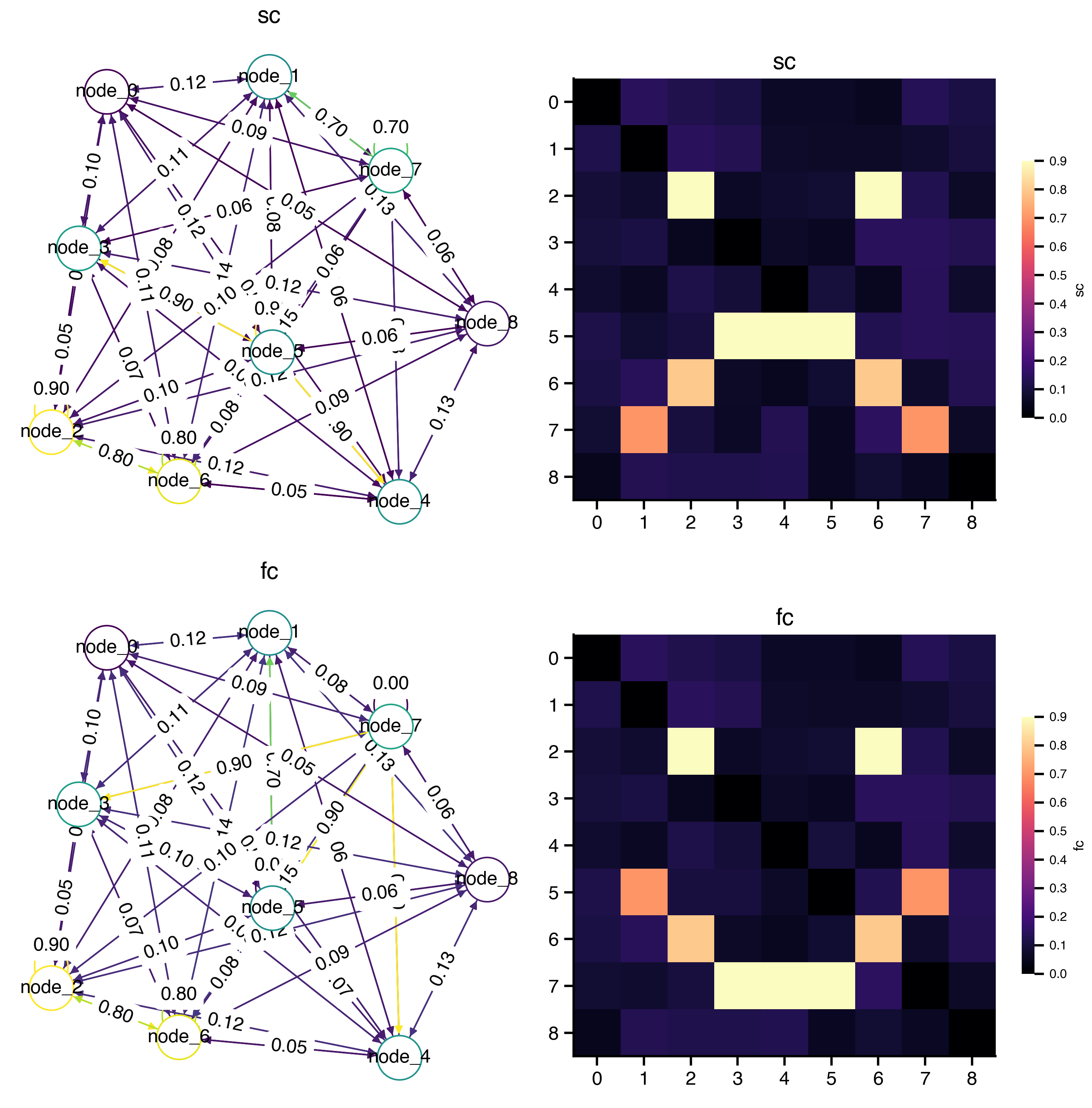 import numpy as np from tvbo import Network np.random.seed(42) noise = np.random.uniform(0.05, 0.15, (9, 9)) np.fill_diagonal(noise, 0) # no self-connections # SC = :(…