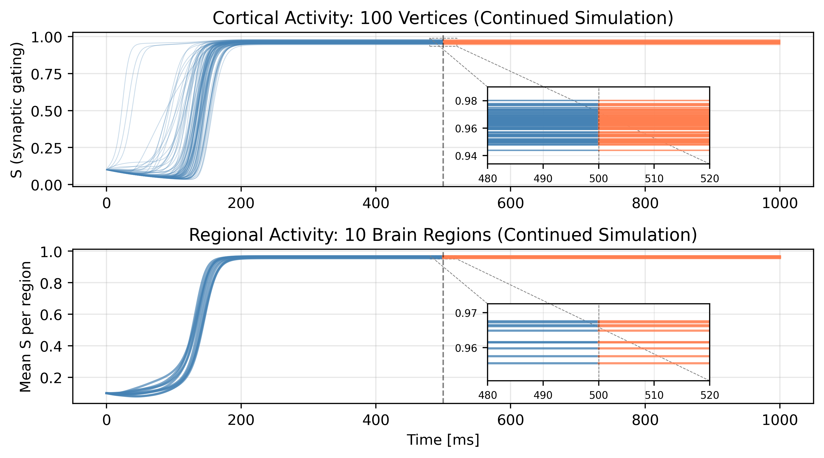 axes[0].set_title(f'Cortical Activity: {len(sample_indices)} Vertices (Continued Simulation)')