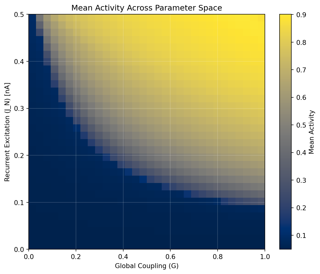 Why is this problem interesting? The Reduced Wong Wang model has two fixed point branches - low activity (~0.1) and high activity (~0.9). Each region tends to approach one of them, but for the desired target level, we need to find a balance between the two. This concept is also known as feedback inhibition control (FIC).
