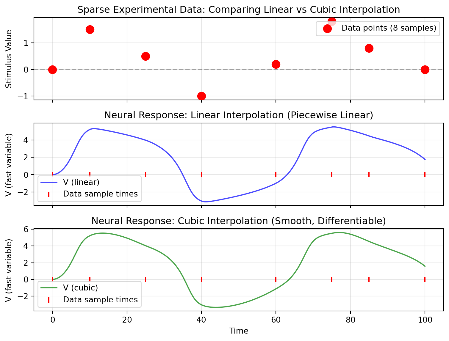 ax3.set_title('Neural Response: Cubic Interpolation (Smooth, Differentiable)')