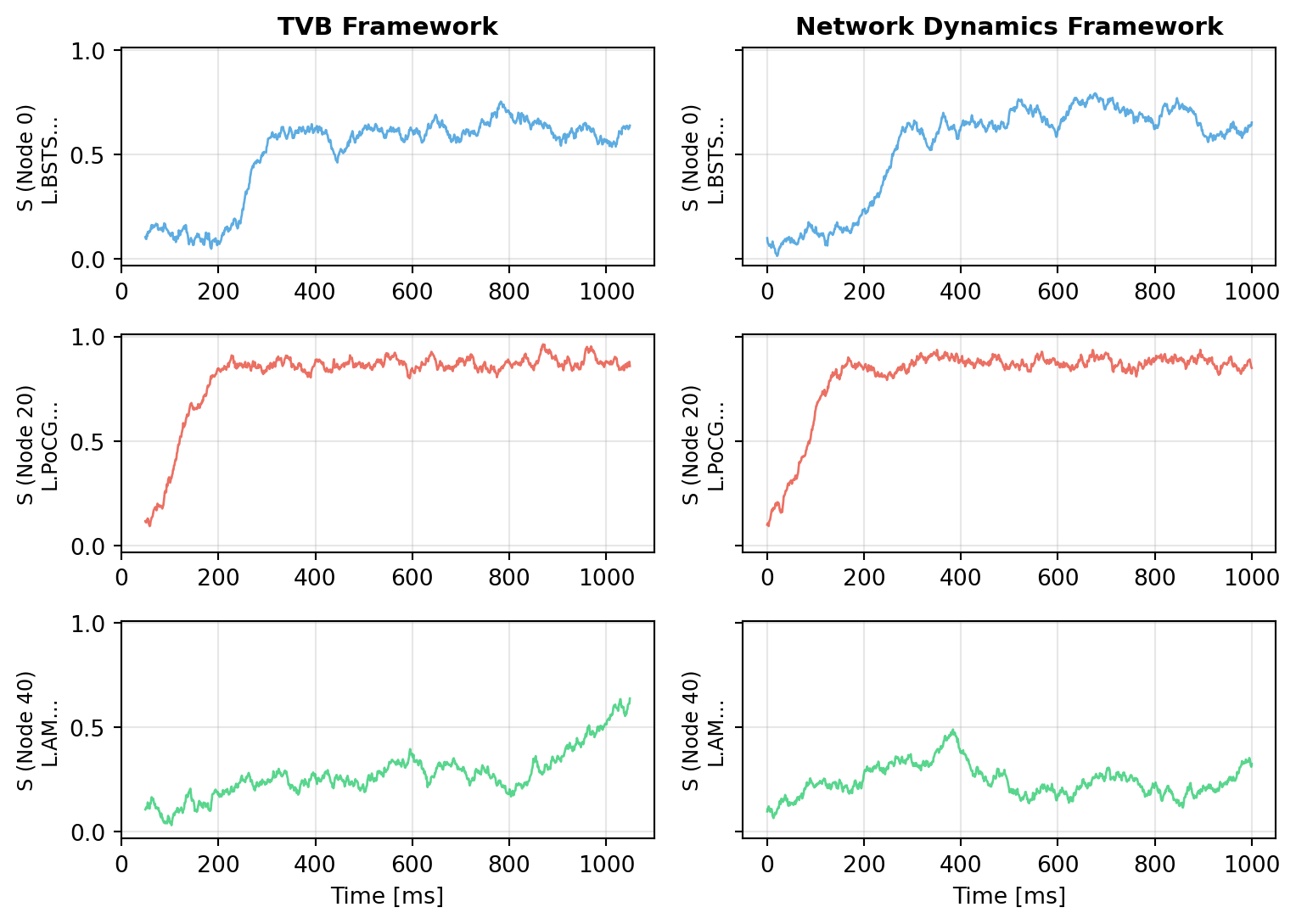 Let's simulate a resting-state brain network using the Reduced Wong-Wang model with empirical connectivity. We'll show both approaches side-by-side so you can see the correspondence between frameworks.